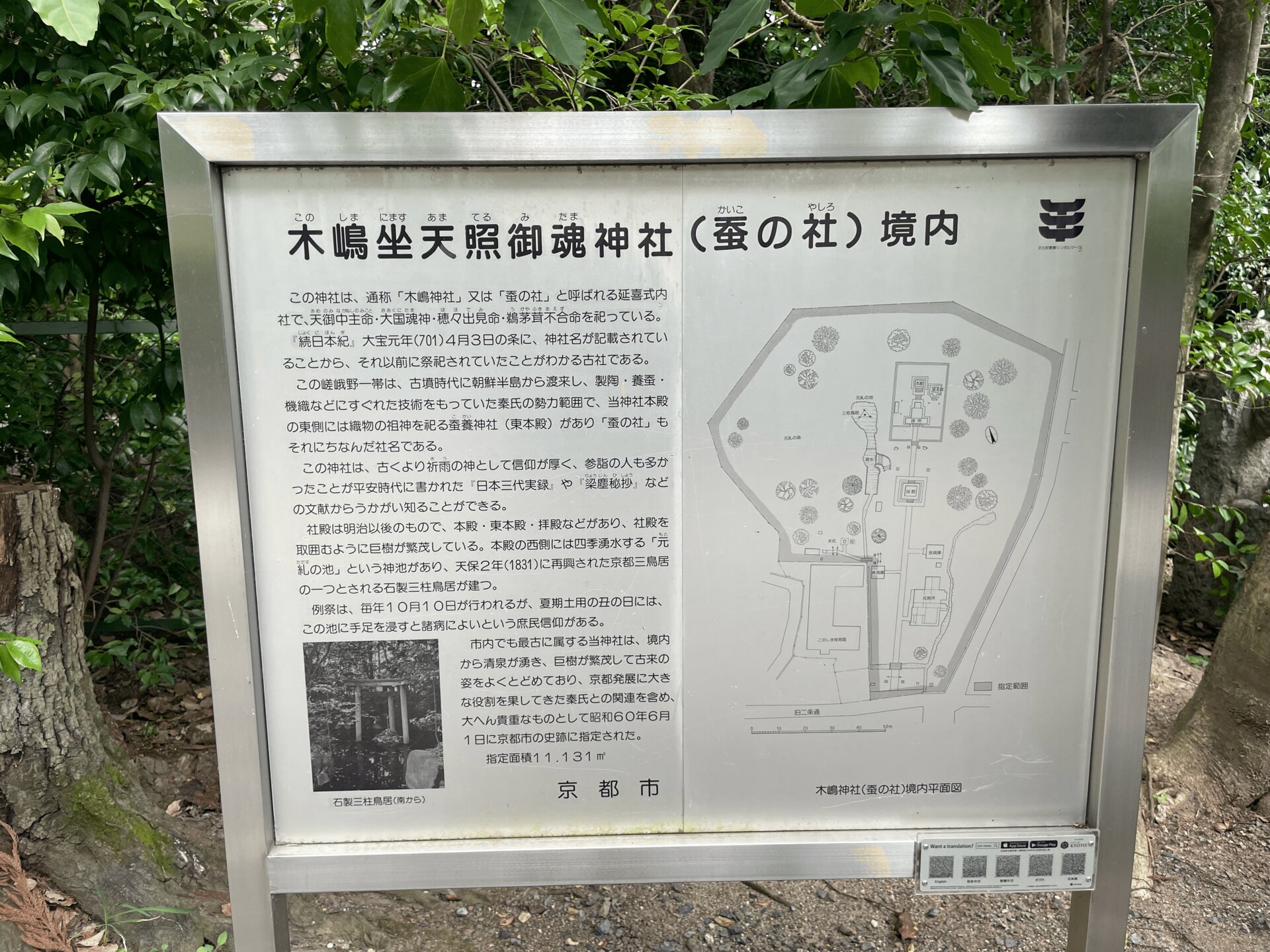 蚕神社と書かれた石柱がでてくる。秦氏は絹で財を成したため,それに感謝して石柱を建てた。