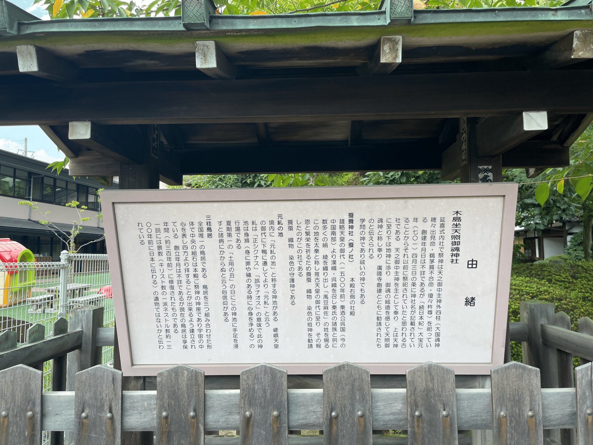 神社の入り口に掲げられた由緒の写真が載っている。これには秦氏が古代キリスト教の一派である景教(ネフトリウス教)の信者であった可能性について記載がある。