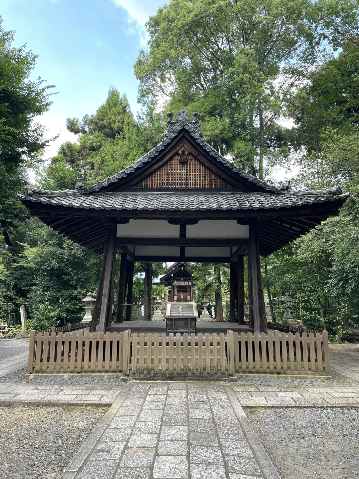 拝殿の西側(左)には三柱鳥居がある。残念ながら柵越しにしか見れず,中に入ることは叶わなかった。宇宙(空)を含めた4方向から拝めるようにできているなんてスケールのでかい鳥居である。