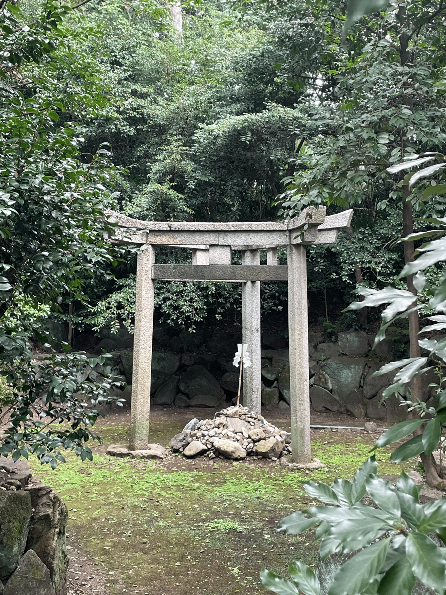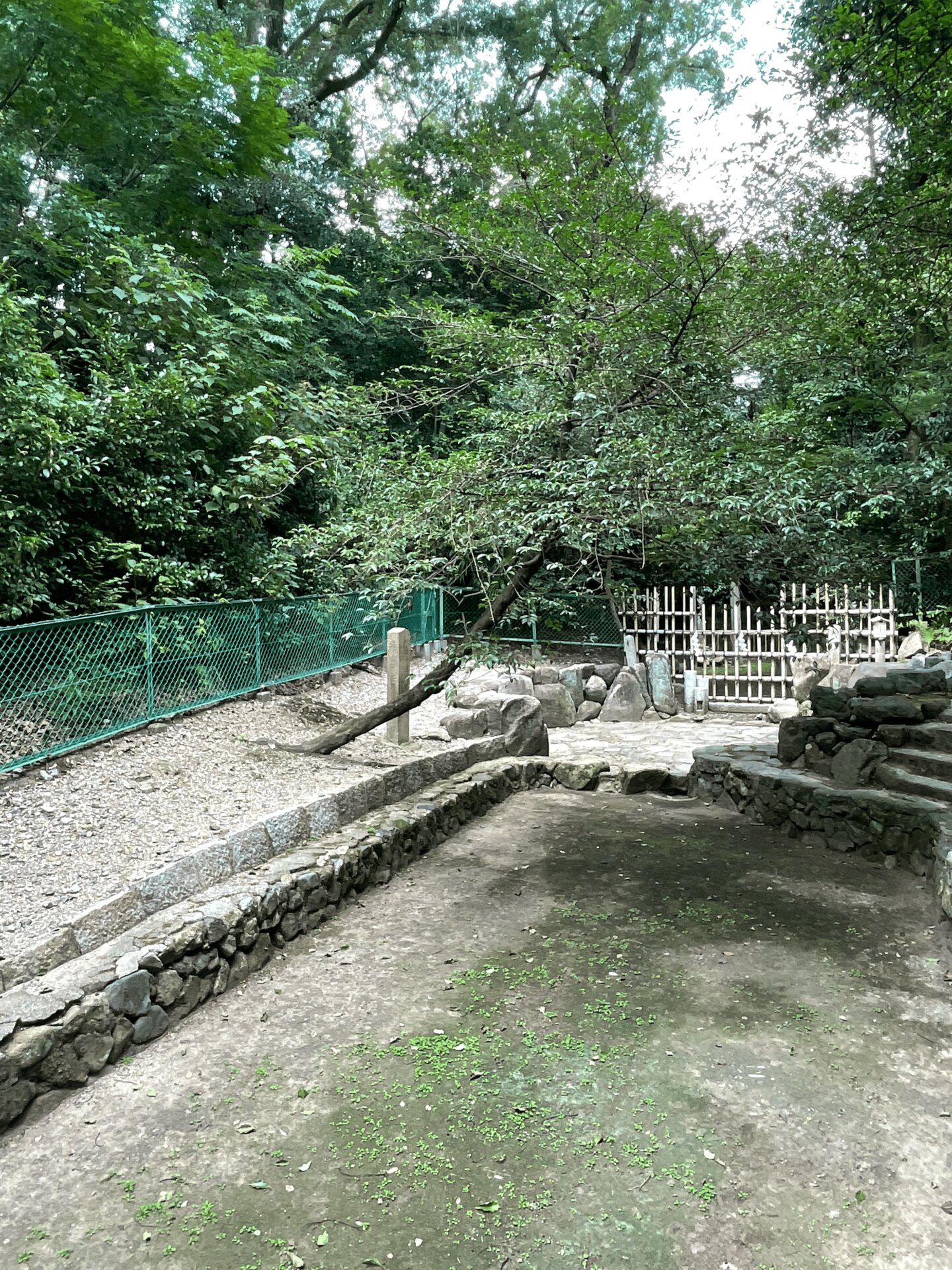 石に囲まれている部分が元糺の池。奥に見える柵の中に三柱鳥居がある。