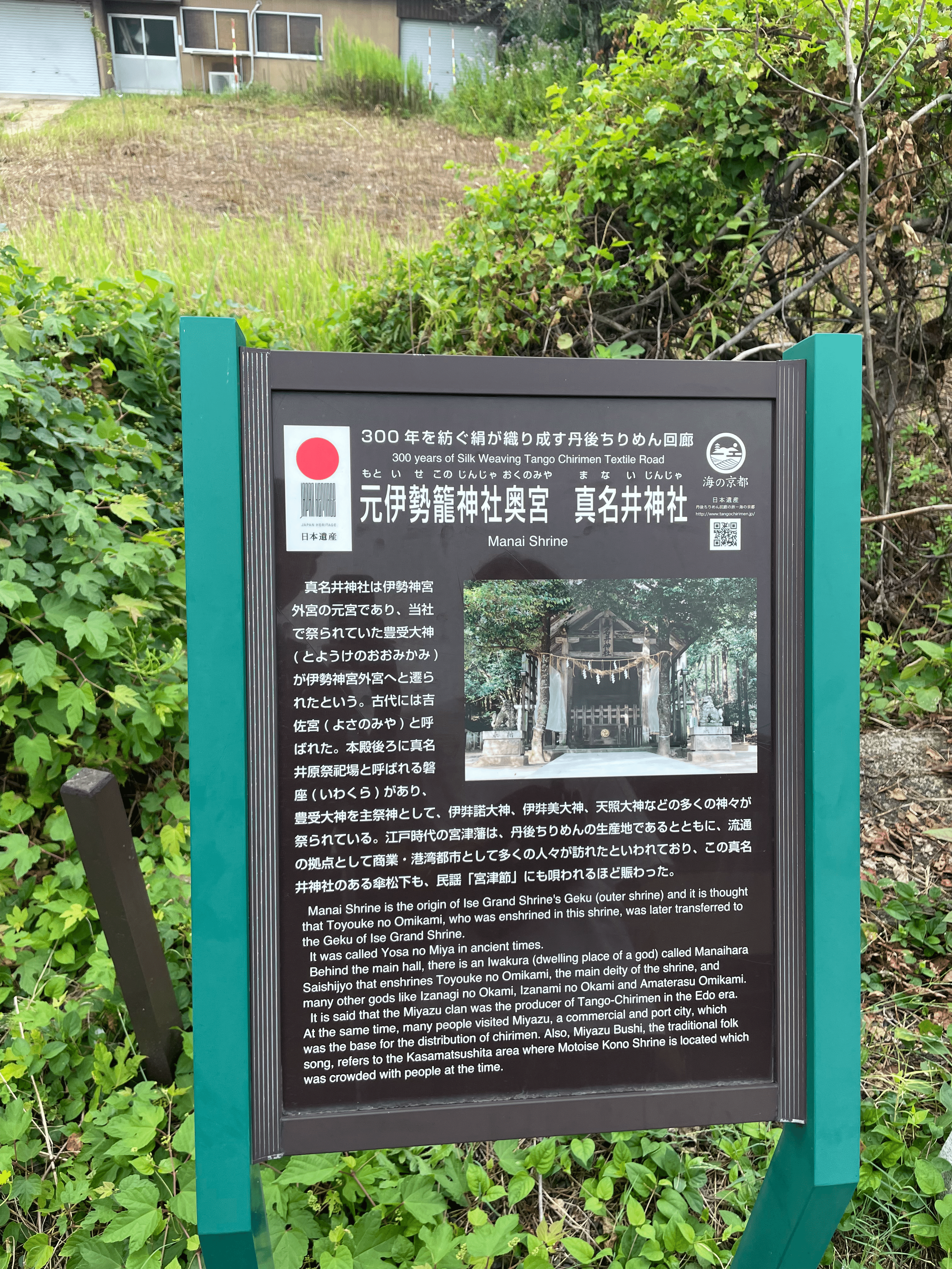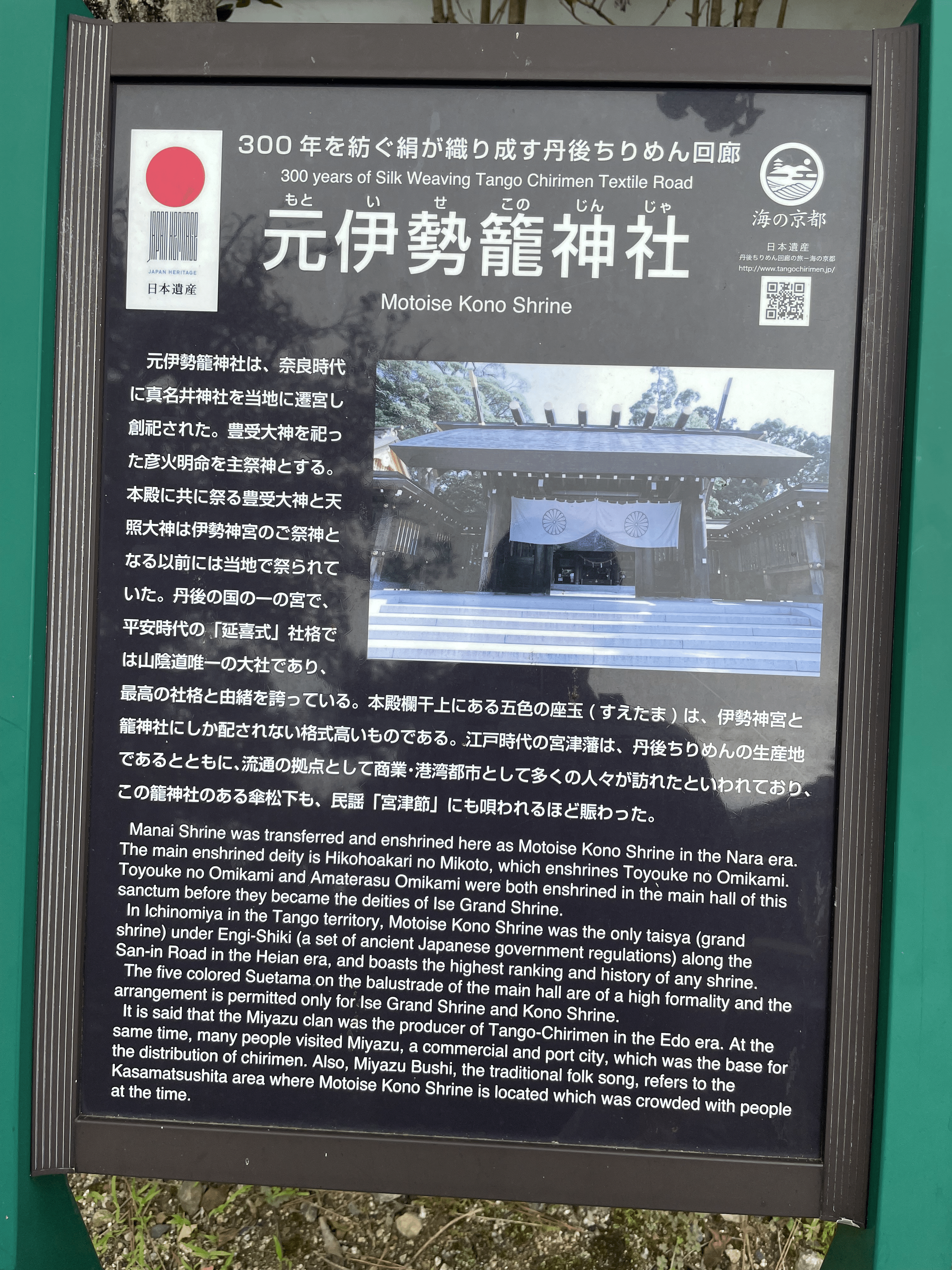 - 第10代崇神天皇の時代に天照大御神が大和国笠縫邑から真名井原に遷座され,豊受大神とともに4年間祀られる → 吉佐宮(よさのみや)という宮号がついた。(これが看板に書かれていた内容)