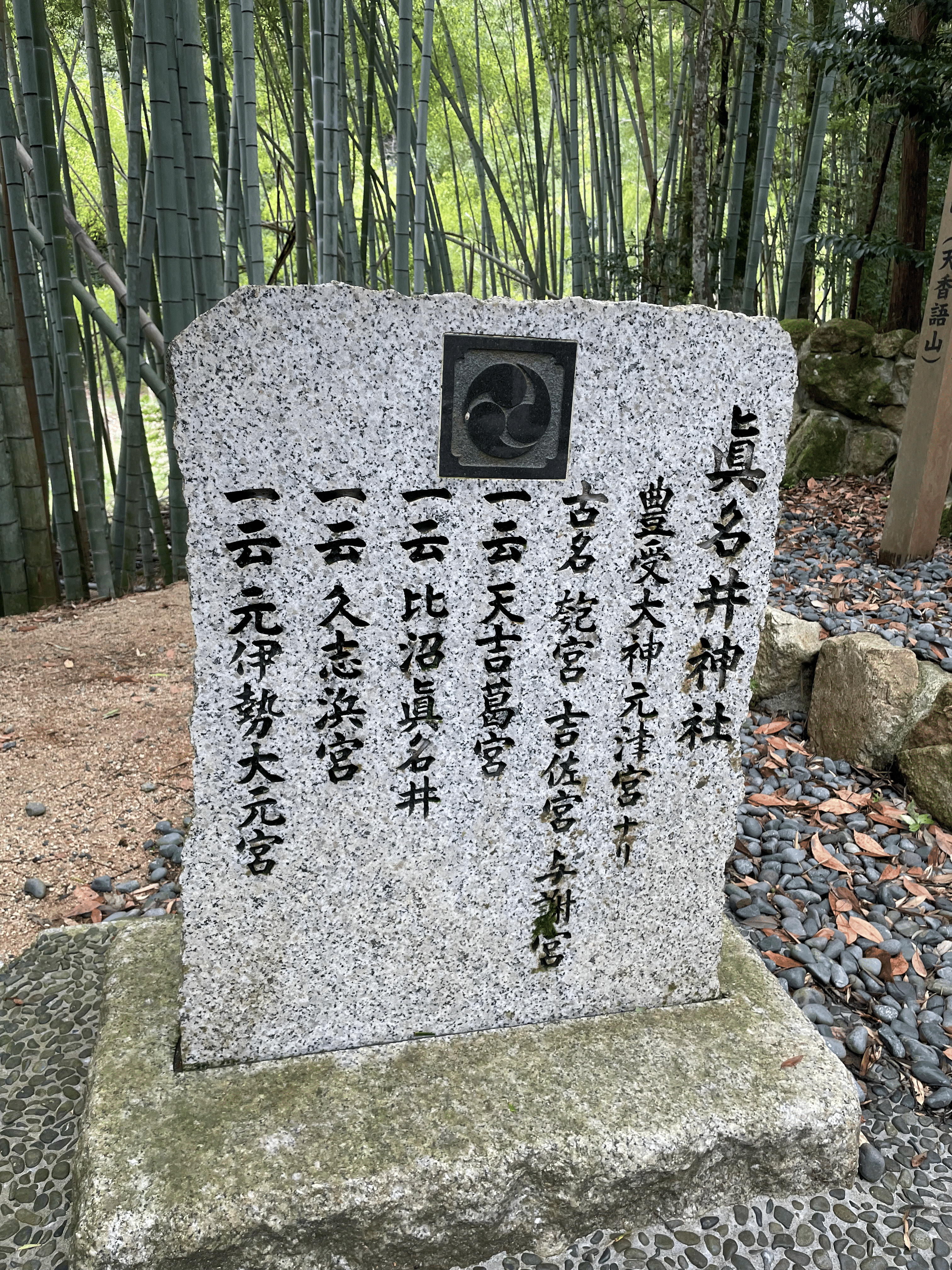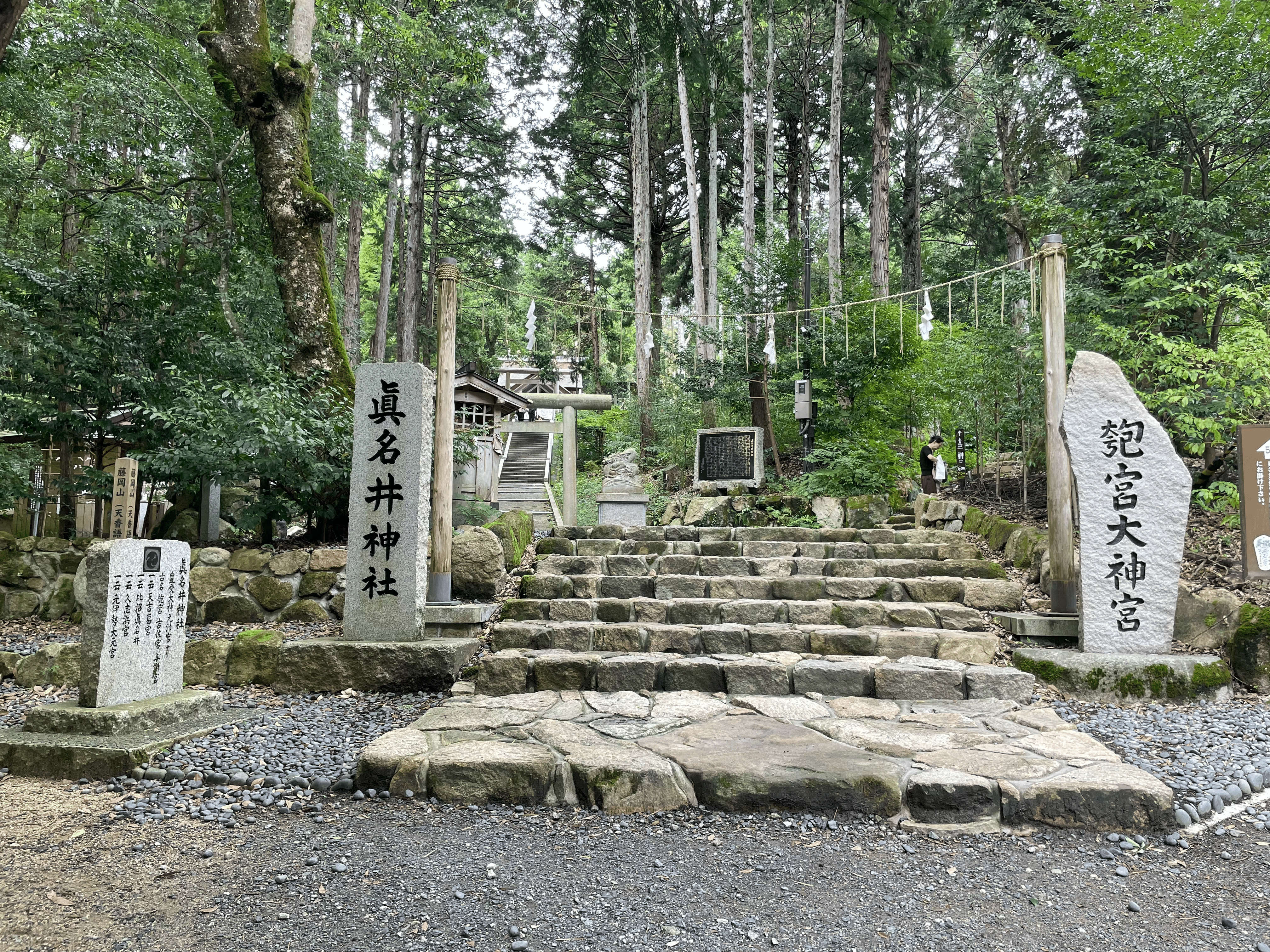 - 磐座(いわくら): 神々の宿る石。眞名井神社の裏にあり,縄文時代の石斧から弥生時代の土器や勾玉も出土していることから古代から神々が祀られていたことがわかる。