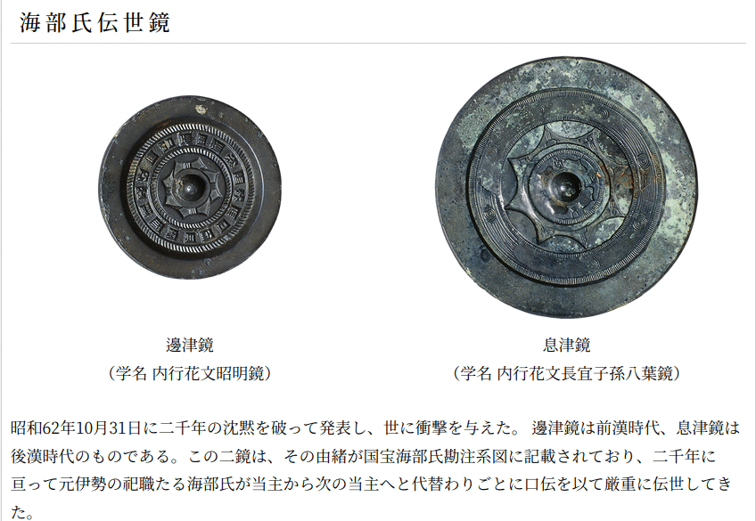 - ニギハヤヒがアマテラスから授かった十種の神宝の息津鏡と邊津鏡が残っている。