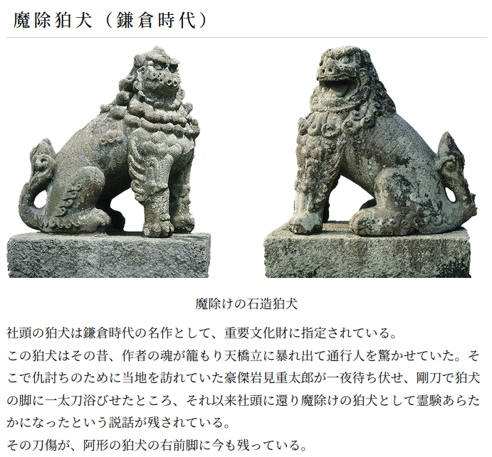 - 魔除狛犬: 鎌倉時代の名作として重要文化財に指定されている。天橋立で通行人を驚かせていたため,岩見重太郎に切りつけられた刀傷が残っている。